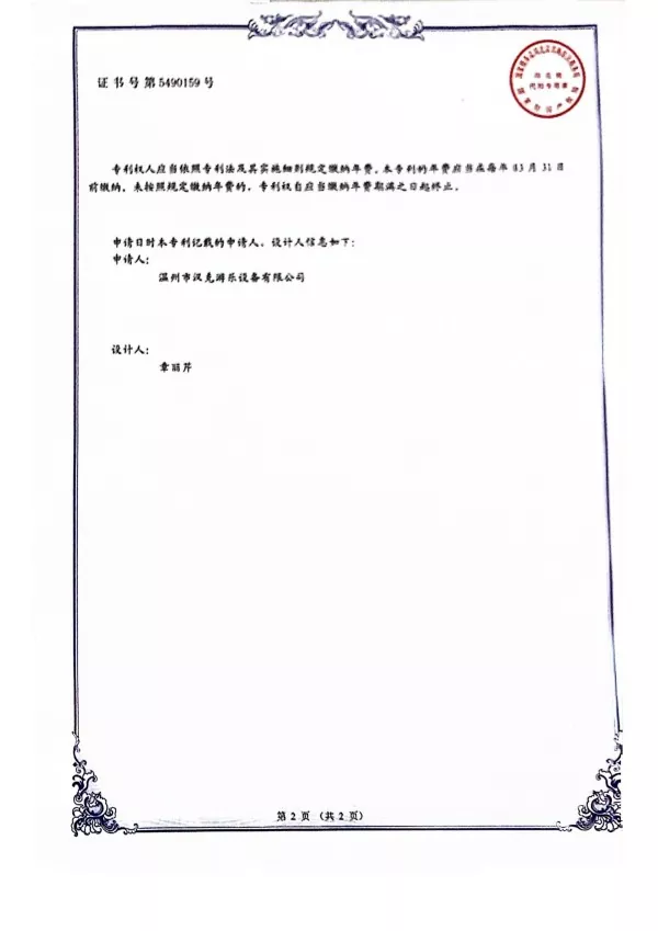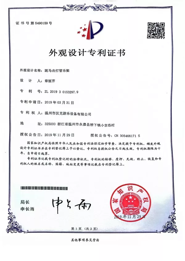 Samtidigt, som en egenutvecklad produkt från Hank, ansökte vi om ett designpatentcertifikat för Zebra Shaped Percussion Instrument-stativ 2019 och fick godkännande från det kinesiska immaterialrättskontoret.